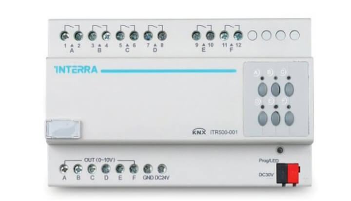 6 Kanal 0-10V Balast Dimmer, her kanal 0-10V yöntemi ile ballast üzerinden dimleme yapabilir. Her kanal için 10A akım taşıma değerinde röle bulunur. Ayrıca manüel olarak da kontrol edilebilir. Aktif ve/vaya pasif ballast tipleri bağlanabilir.
